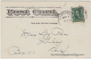 Undivided back, used postcard. Postmarked April 1, 1909, from Santa Rosa, California. Publisher: A.T. F. Co. Price: $8.00 This is the first in a collection from Miss Lily Rea. Her address at this time is Box 23, Gilroy, California. We’ll…Read More…