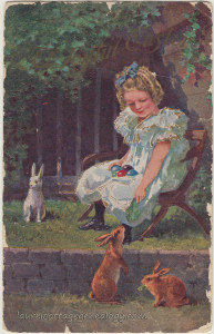 Trade card showing “Stevens – The Photographer, McVicker’s Theatre Building, 14 Photographs, 3 Styles, $3.00.” This advertising card, in colors of blue-green, pink, and brown with a gold-tone border is entitled, “La Fuite des Oiseaux” and shows a boy and girl, in flowing Grecian-style attire. We see the scene depicted here just after the young lady has released some birds (not shown) from their captivity while the young man looks on. Some short biographical info found about the photographer in question is as follows: