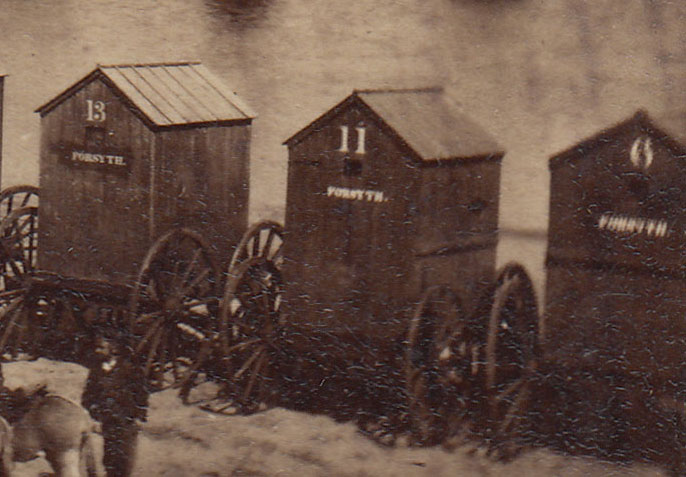 Note the surname Forsyth on a few of the conveyances, which we discovered was one of the rental companies at the time the photo was taken. (Could the W. F. in the 1862 letter to the editor have been a Forsyth?) Other machines in the photo show different company names, but they’re too blurred to make out.