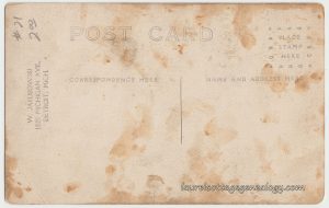 A Real Photo Postcard, not in good shape, as you can see by the “foxing” marks and the creases, most notably in the top right corner. More by Władysław Jakubowski can be viewed at Michigan Polonia and Polish Mission. His stamp on the back shows:
