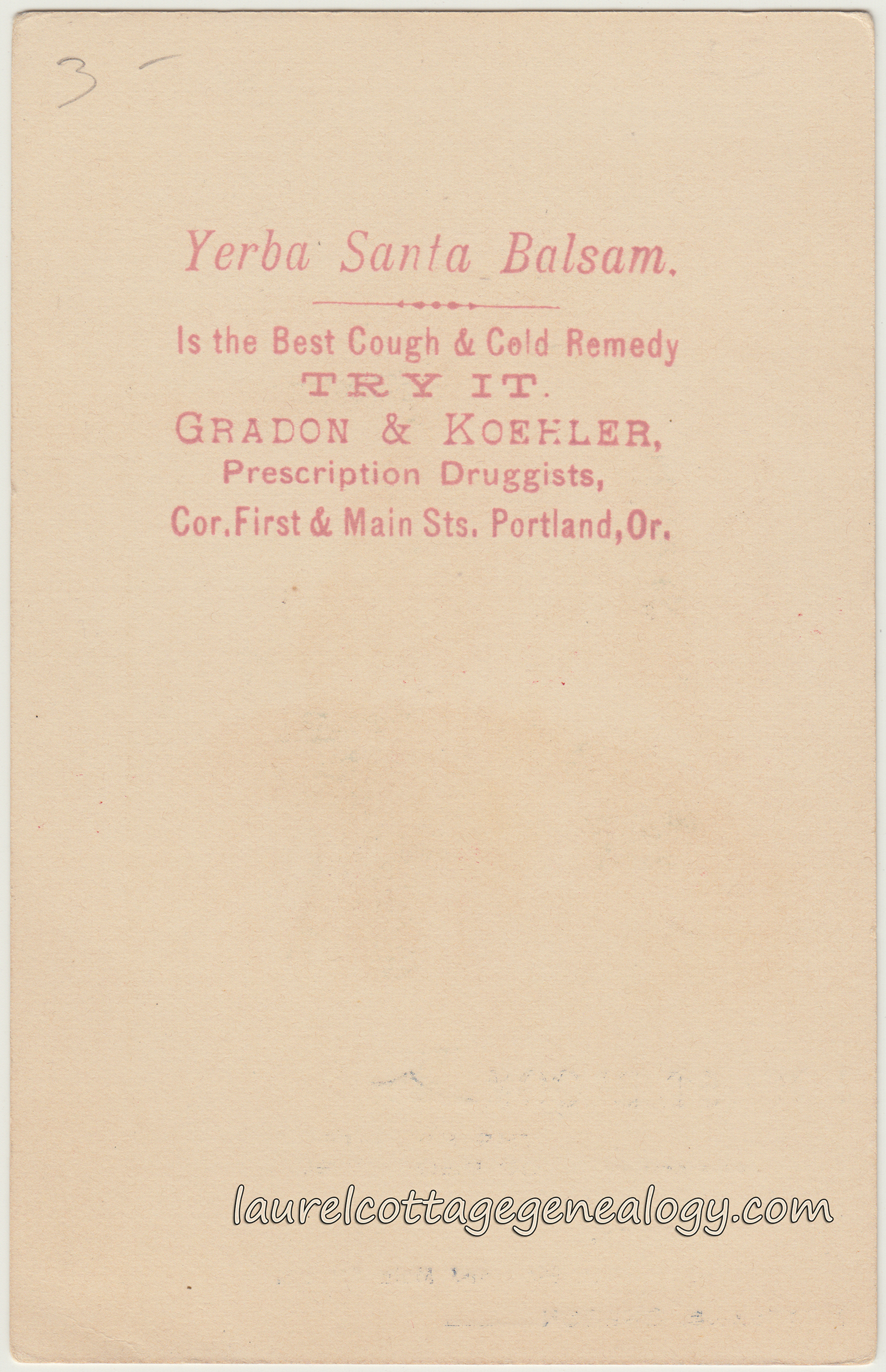 Printed or stamped on the back of the card is, “Yerba Santa Balsam. Is the Best Cough & Cold Remedy. Try It. Gradon & Koehler, Prescription Druggists, Cor. First & Main Sts. Portland, Or.”