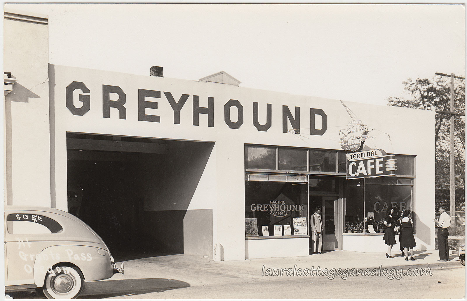 Early 1940’s Real Photo Postcard of the Greyhound Depot in Grants Pass, Oregon, showing the depot entrance and café with a small group of several people (a gentleman and three young women) exchanging conversation and to their right, a gentleman in a double-breasted suit, holding a cigarette, on the doorstep of the entrance. This postcard appears to have been manufactured for the Grants Pass station for travelers to purchase. The location and probably the photographer or printer information shows at the bottom left in white as “G13 PAT. [or P^T?] At Grants Pass Oregon.” The partial view of the vehicle in the photo is the best clue in dating this postcard: The car is a 1941 Ford Super Deluxe 2 Door Sedan.