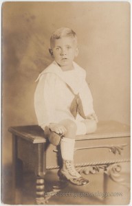 Real Photo Postcard from sepia-toned studio photo of a beautiful blonde little boy who looks to be about four or five. He wears the ever-popular white sailor suit, in short pants, with knee socks and two-toned high button shoes. He is seated on a small ornately carved wooden table. The stamp box on the back is an AZO with two triangles up and two down. That dates this postcard in a broad range from about 1910 – 1930, but if the photo was taken within these dates, and not prior to 1910, then more likely it is from the early 1910s due to the shoe style. (I consulted various online sources.) An excellent article on the high button shoe explains that one aspect of the change away from the high button would have been due to the leather rationing during WWI.