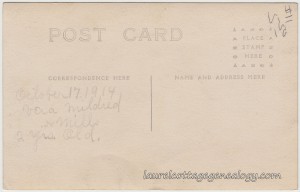 The photo for this Real Photo Postcard was taken on Vera’s birthday, October 17th. As the back of the postcard states she is two years old here. And this would appear to be her momma with her, due to the strong resemblance. The 1920 Federal Census for Compton Township, Los Angeles County, California shows Vera, age seven, born in California; her parents Samuel C. Mills, an iron worker, born in Kansas, about 1881 and Frances R. Mills, born in Utah, about 1893; and Vera’s brothers, Clifford C., age 3 and 4/12, and Victor L., not yet one month old. (This census was taken January 12th.) Both the boys were also born in California. The parents owned the residence on Euclid Avenue. By 1930, there was another addition to the family, Jack A. Mills, born in California, about 1927.