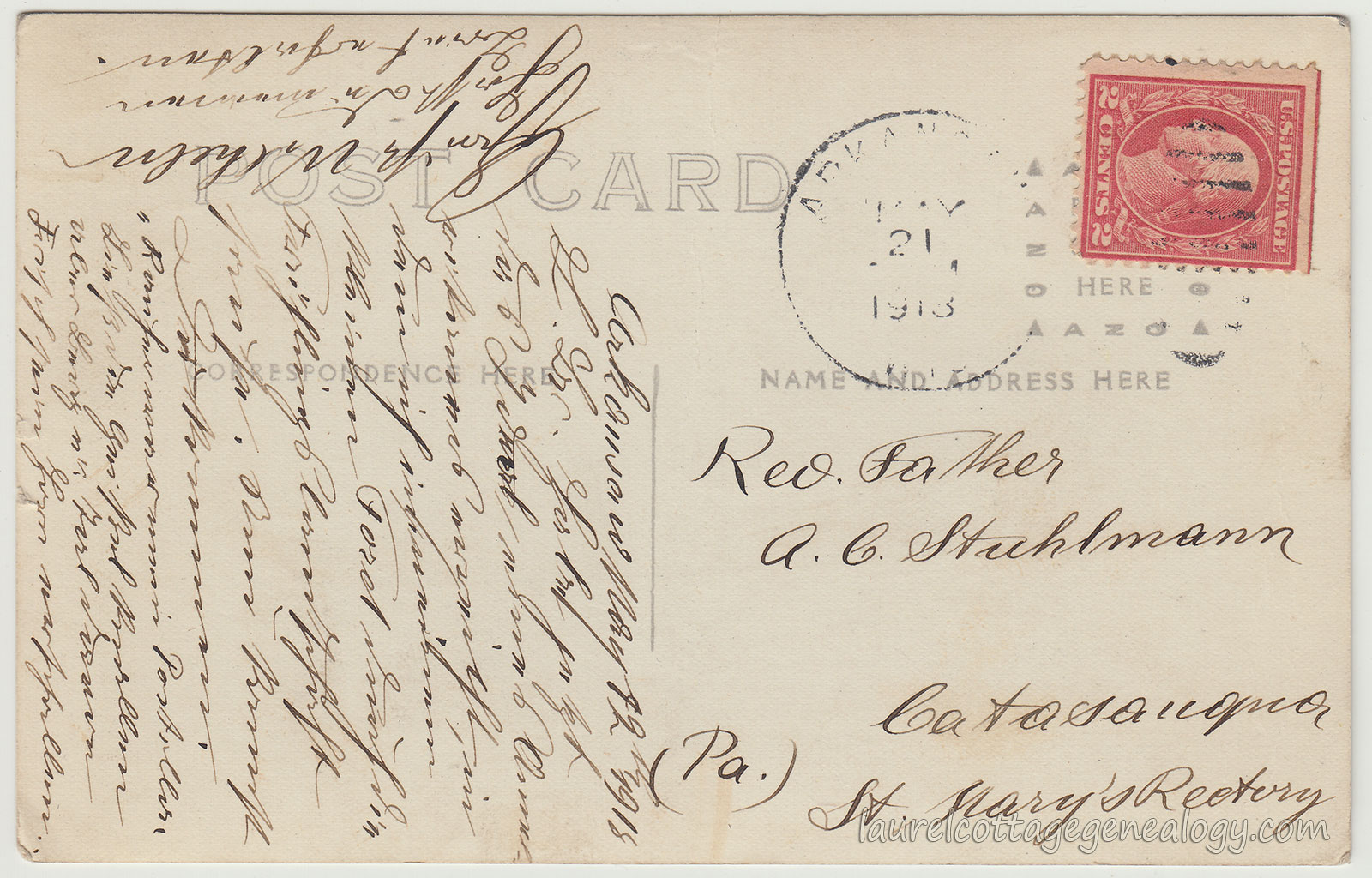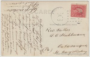 Another, again a little hard to decipher without knowing German. The sender appears to have been “M. A. Stempa.” But it’s beautiful artwork, printed of scenes from the state of Baden-Wuerttemberg, located in the south of Germany: that of the mountains called Hohenstaufen and Rechberg, and the Barbarossa kirchlein (kirchlein means little church) and church at Schwäbisch Gmünd (Hohenrechberg pilgrimage church, built 1686). The reverse of the card shows the heading Königreich Württemberg, which translates as the Kingdom of Württemberg, a German state which existed from 1805 to 1918. See last link below.