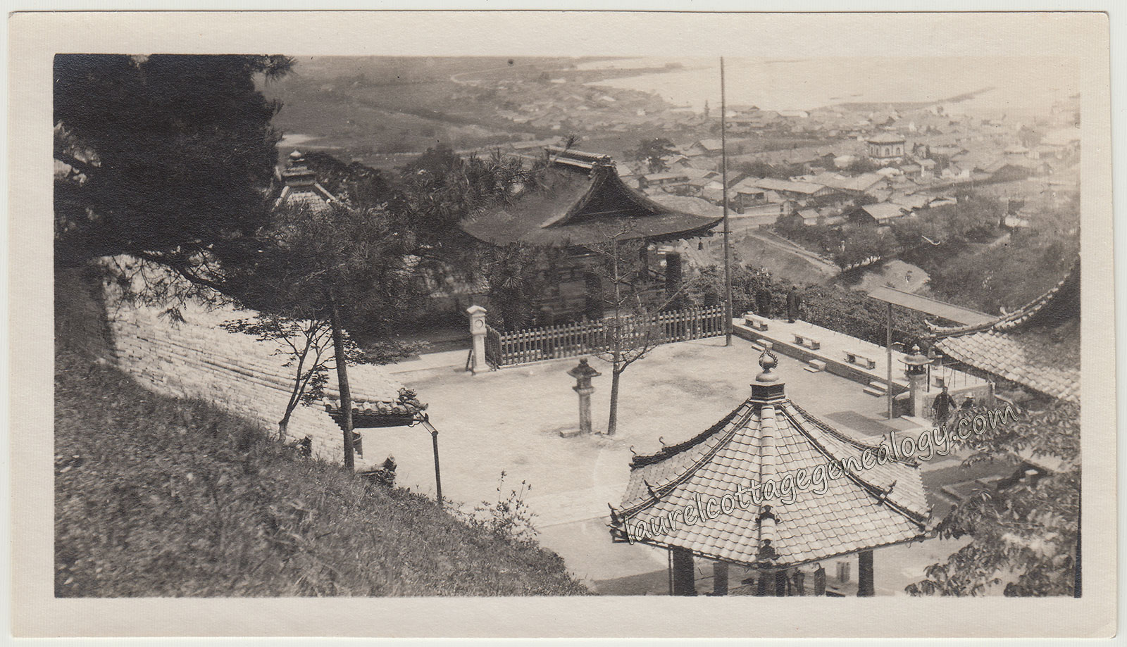 A Buddhist temple that was established in the 7th Century as a, “Uji-dera Temple (temple built for praying clan’s glory),” and one of the four largest temples in Japan. The view we see looks east toward the city of Otsu and Lake Biwa (the largest lake in Japan). There are some people appearing in this photo, as well – four men, one seemingly gazing up toward the person taking the photo.