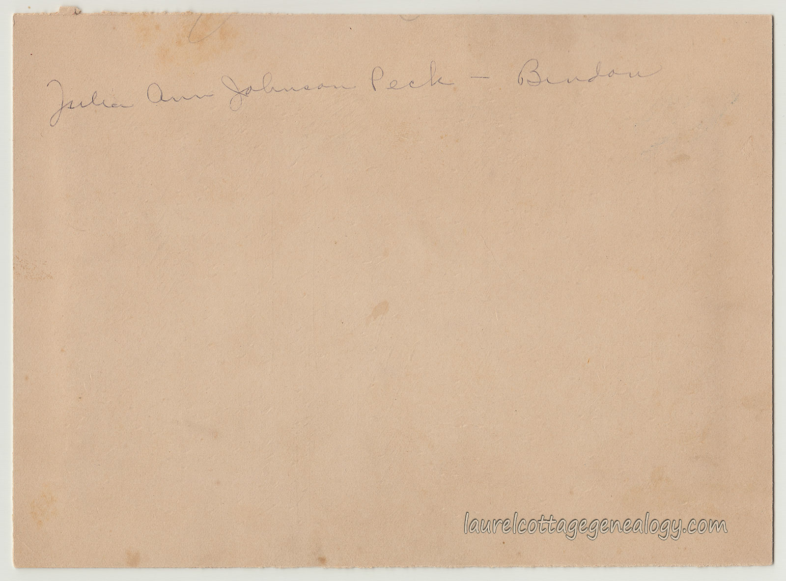 From the description on the back one assumes Johnson is Julia Ann’s maiden name, she married a Peck, and they lived in Bindon. However, the only Bindon for location shows up in Somerset, England, and no records were found there. So, other than Bindon being a street name or some type of remote possibility like the family called the home the Bindon house, or something like that, the next logical scenario is that Bindon was Julia’s second marriage.