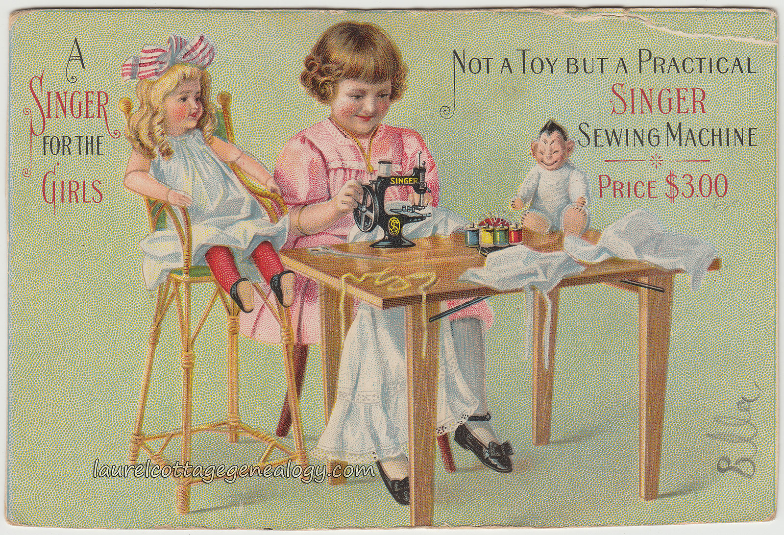 “A Singer for the Girls. Not a Toy But A Practical Singer Sewing Machine. Price $3.00.”