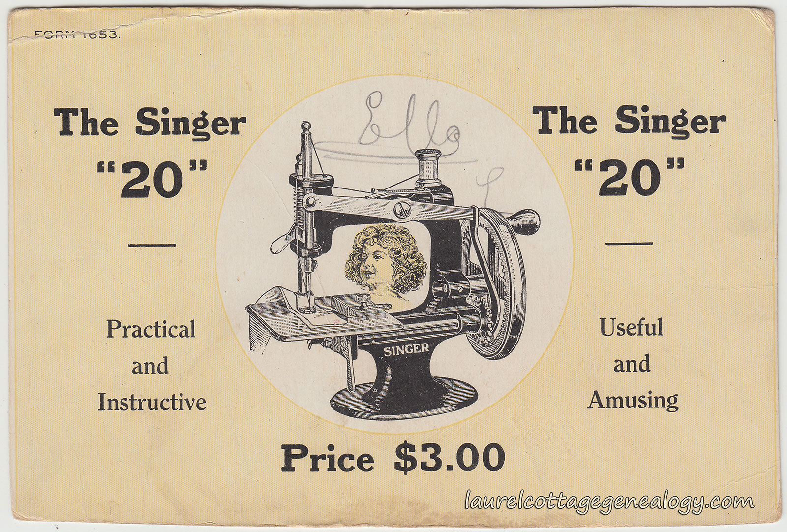 The back shows: “The Singer ’20’ Practical and Instructive. Useful and Amusing. Price $3.00” and an illustration of the machine with a girl’s face in the center.